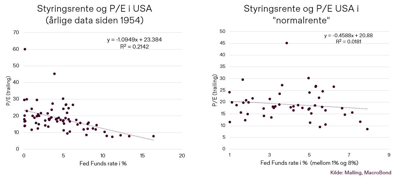 Damodaran (2012) viste at korrelasjonen mellom P/E og rente er positiv i perioder med ekstrem pengepolitikk, men at den er tilnærmet ikke-eksisterende i normale rente-regimer. Det kan vi også se med oppdaterte data for aksjemarkedet:
